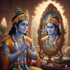 અતીતની અટારીએ સ્મૃતિ-સમૃદ્ધિ ફાનસની જેમ ઝળાંહળાં હોય છે. આપણે અરીસામાં જોઈએ ત્યારે ઘણી વાર પ્રતિબિંબની પાછળનું અચાનક નજર સામે ઉભરવા લાગે. કૃષ્ણ જો અરીસામાં જુએ તો એને શું દેખાય એનું ભાવપ્રદ અને રસપ્રદ ગીત માણીએ. સ્વરકારોને આગ્રહ નહીં, પણ દુરાગ્રહ સાથે વિનંતી કે આ ગીતનું સ્વરાંકન થાય તો પ્રતિબિંબથી પારાવાર સુધી જવાની કોઈ સૂરમયી કળ અમને ભાવકોને મળે.